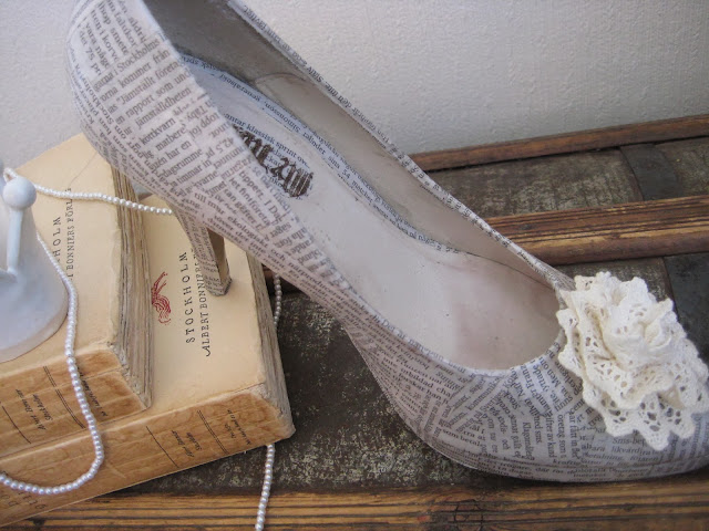 Det finns så mycket roligt man kan göra med gamla saker. Att man kan göra prydnassaker av gamla skor är nog inte det första man tänker på, men på något sätt fick jag idén. För att göra detta behöver man tidningspapper och hobby-lack. "Limma" fast små bitar av tidningspappret med lacket och applicera också lack över pappret. Vill man kan man fästa en dekoration i fram på skon. Jag har också limmat papper i skon och stämplat i skon för att det ska se autentiskt ut.
